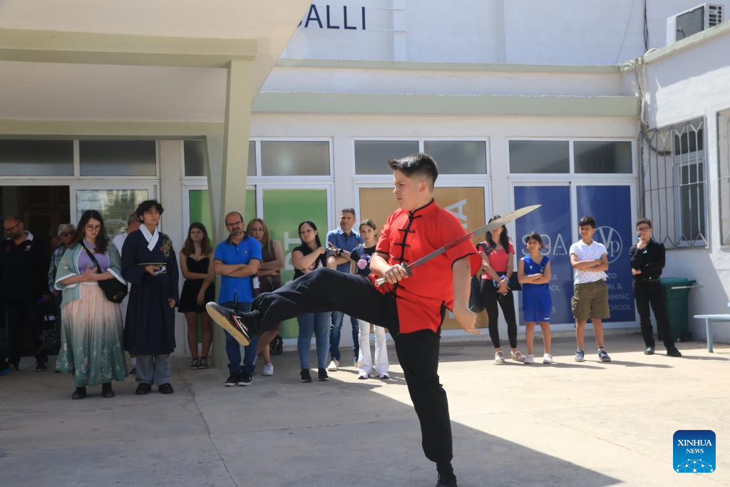 A secondary school student performs Chinese martial arts in the "Chinese Bridge" competition in Hamrun, Malta, May 25, 2024. (Xinhua/Chen Wenxian)