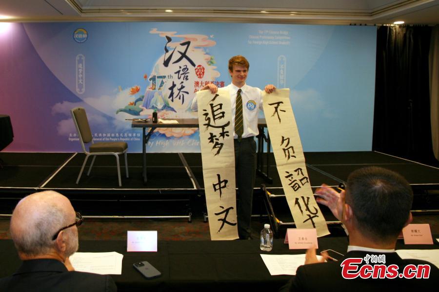 A contestant displays his Chinese calligraphy during the final round of the 17th "Chinese Bridge" Chinese Proficiency Competition for foreign high schools in Sydney, Australia, May 26, 2024. (Photo: China News Service/Gu Shihong)