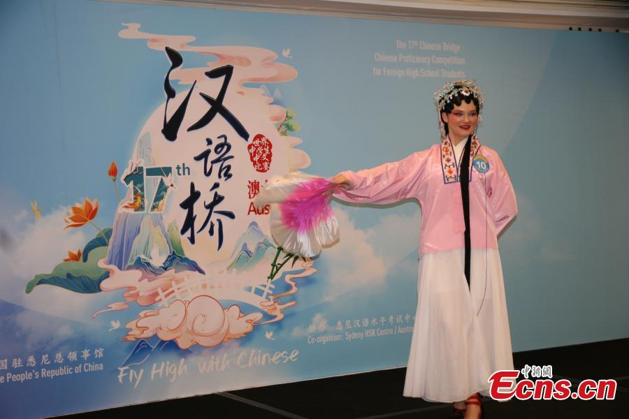 A contestant performs during the final round of the 17th "Chinese Bridge" Chinese Proficiency Competition for foreign high schools in Sydney, Australia, May 26, 2024. (Photo: China News Service/Gu Shihong)