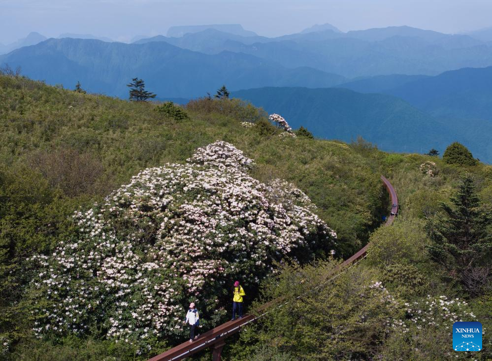 An aerial drone photo taken on May 26, 2024 shows azalea blossoms on the summit of Mount Emei in southwest China's Sichuan Province. April, May and June see the most beautiful azalea blossoms every year at Mount Emei, dubbed the "Kingdom of Azalea," home to about 30 species of this plant family. (Xinhua/Jiang Hongjing)