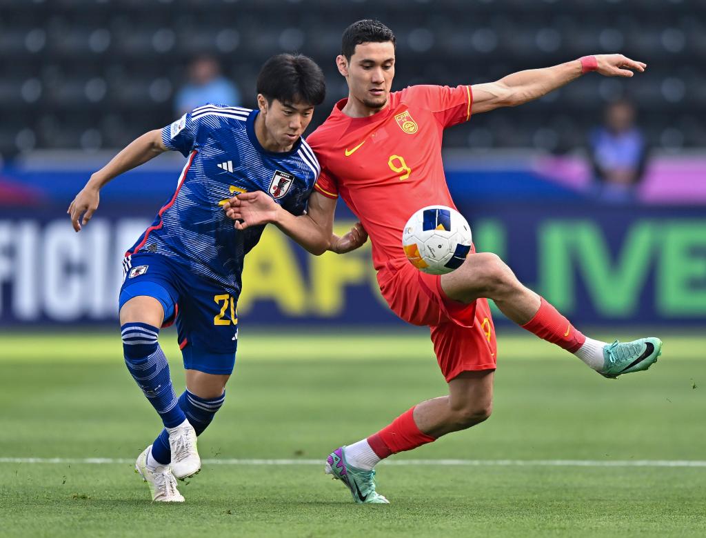 Behram Abduweli (R) of China vies with Hirakawa Yu of Japan during the Group B football match between China and Japan of AFC U23 Asian Cup Qatar 2024 at Jassim Bin Hamad Stadium in Doha, Qatar, on April 16, 2024. (Photo by Nikku/Xinhua)