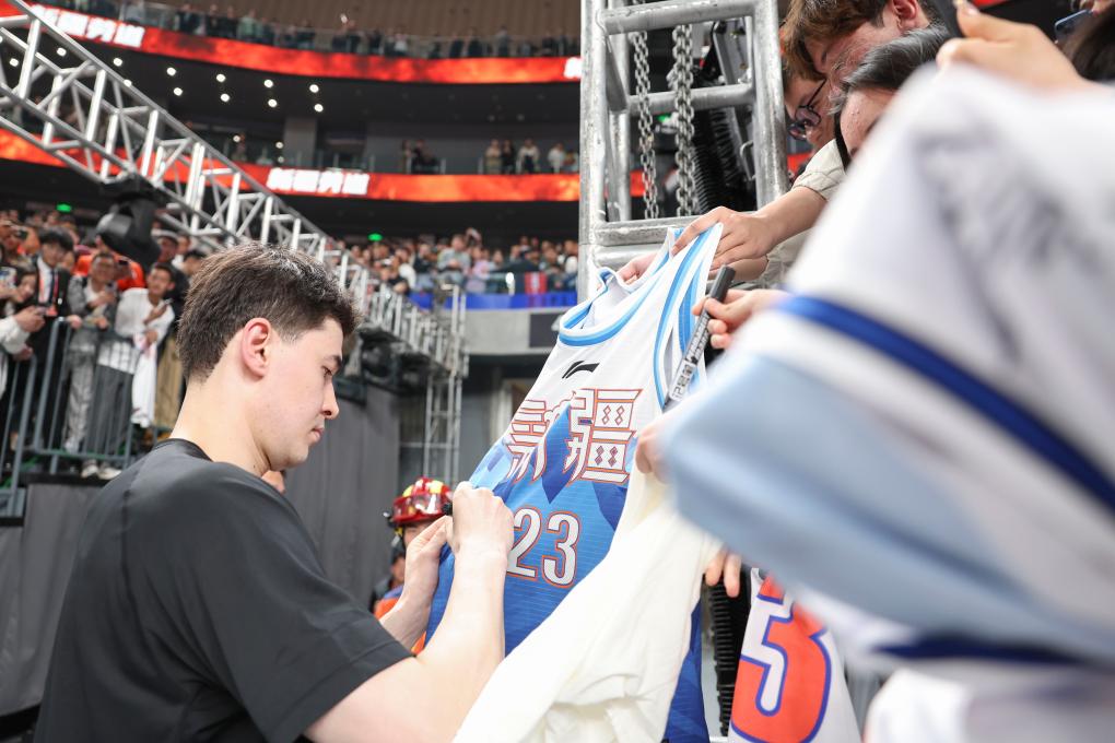 Abdusalam Abdurexit of Xinjiang Flying Tigers signs autographs during the play-off semifinal first leg match between Xinjiang Flying Tigers and Zhejiang Golden Bulls at the 2023-2024 season of the Chinese Basketball Association (CBA) league in Urumqi, northwest China's Xinjiang Uygur Autonomous Region, May 2, 2024. (Xinhua/Hu Huhu)