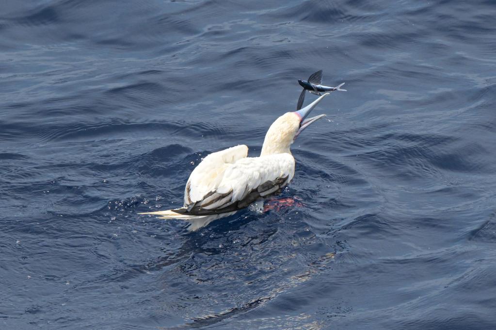 A red-footed booby catches a flying fish over the South China Sea, May 22, 2024. (Xinhua/Pu Xiaoxu)