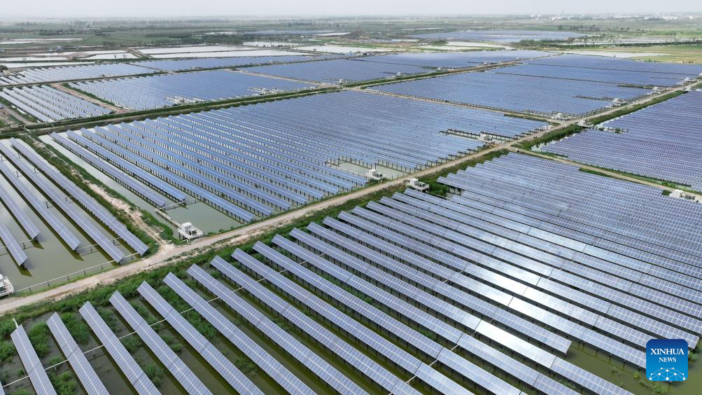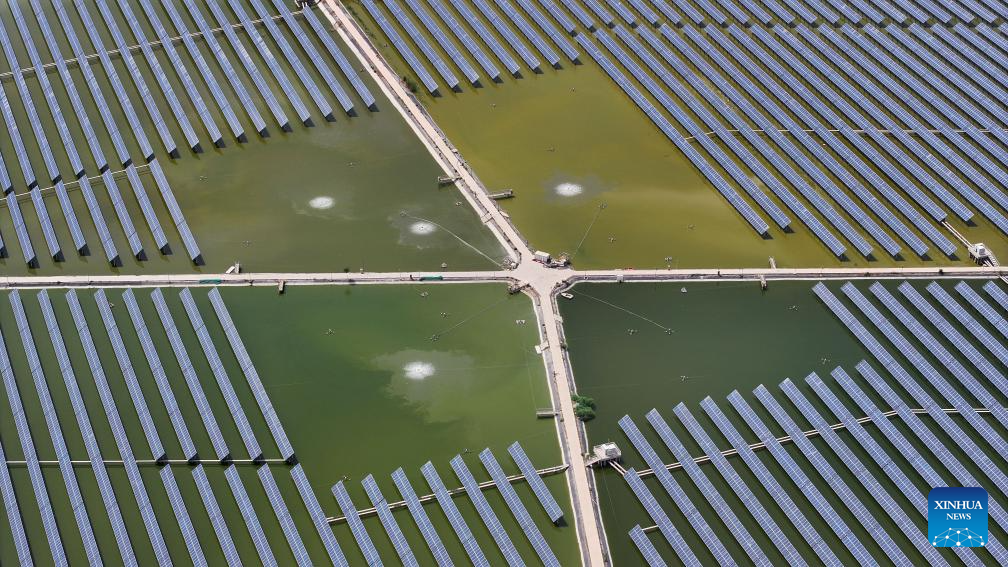 An aerial drone photo taken on May 25, 2024 shows a fishery-solar power integration project in Changxin Township of Helan County, Yinchuan City, northwest China's Ningxia Hui Autonomous Region. Helan County has been popularizing fishery-solar power integration projects as a more efficient and sustainable way to develop its fishery industry. Arrays of photovoltaic modules are set up on fishponds to avail of the generous sunlight while providing shield for the fish therein. These projects have brought extra income to local fishpond operators. (Xinhua/Wang Peng)