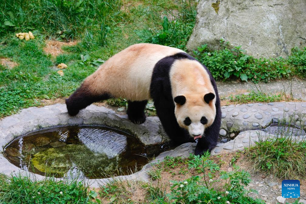 Giant panda Fu Bao wanders at the Shenshuping giant panda base in Wolong National Nature Reserve in southwest China's Sichuan Province, May 27, 2024. (Xinhua/Shen Bohan)