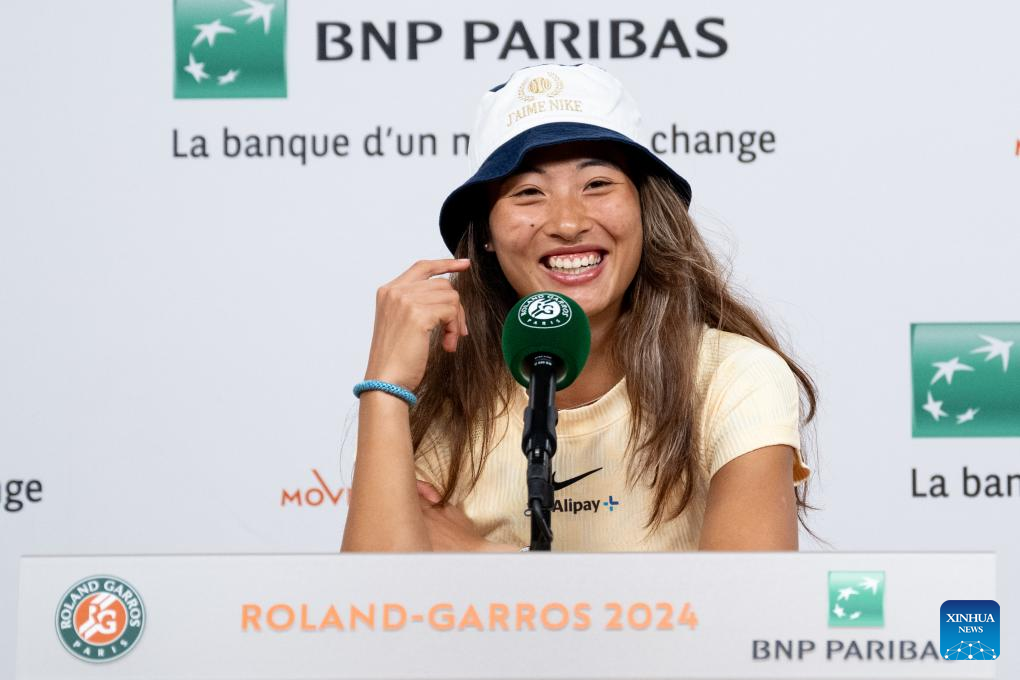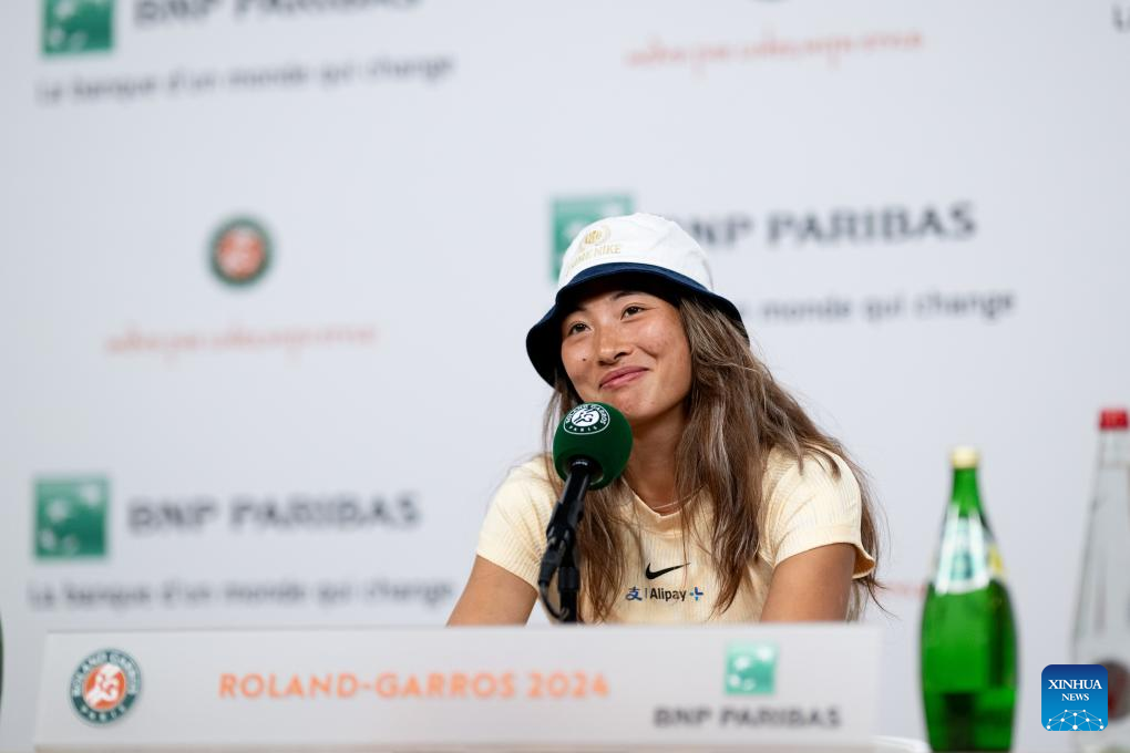 Zheng Qinwen of China attends the press conference after winning the women's singles first round match against Alize Cornet of France at the French tennis tournament at Roland Garros in Paris, France, on May 28, 2024. (Xinhua/Meng Dingbo)