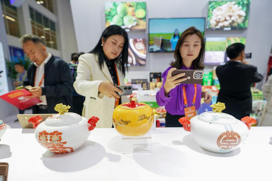 Visitors take photos of exhibits at the China International Conference for the Cooperation on the Premium Geographical Indication Brands 2023 in Tangshan, north China's Hebei Province, Oct. 24, 2023. (Photo by Wang Zhitong/Xinhua)