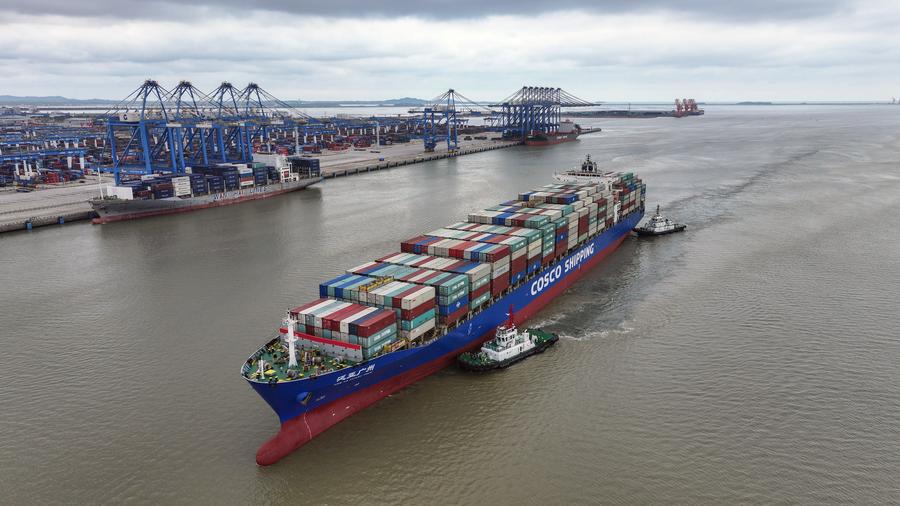 An aerial drone photo shows a ship sailing into Qinzhou Port in Qinzhou, south China's Guangxi Zhuang Autonomous Region, May 19, 2024. (Xinhua/Zhang Ailin)