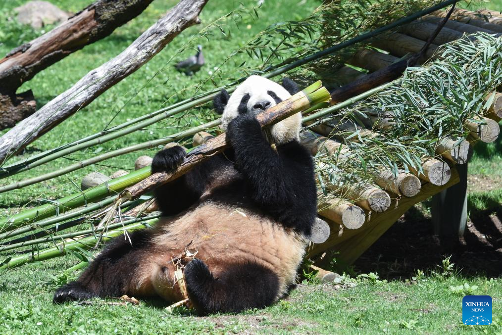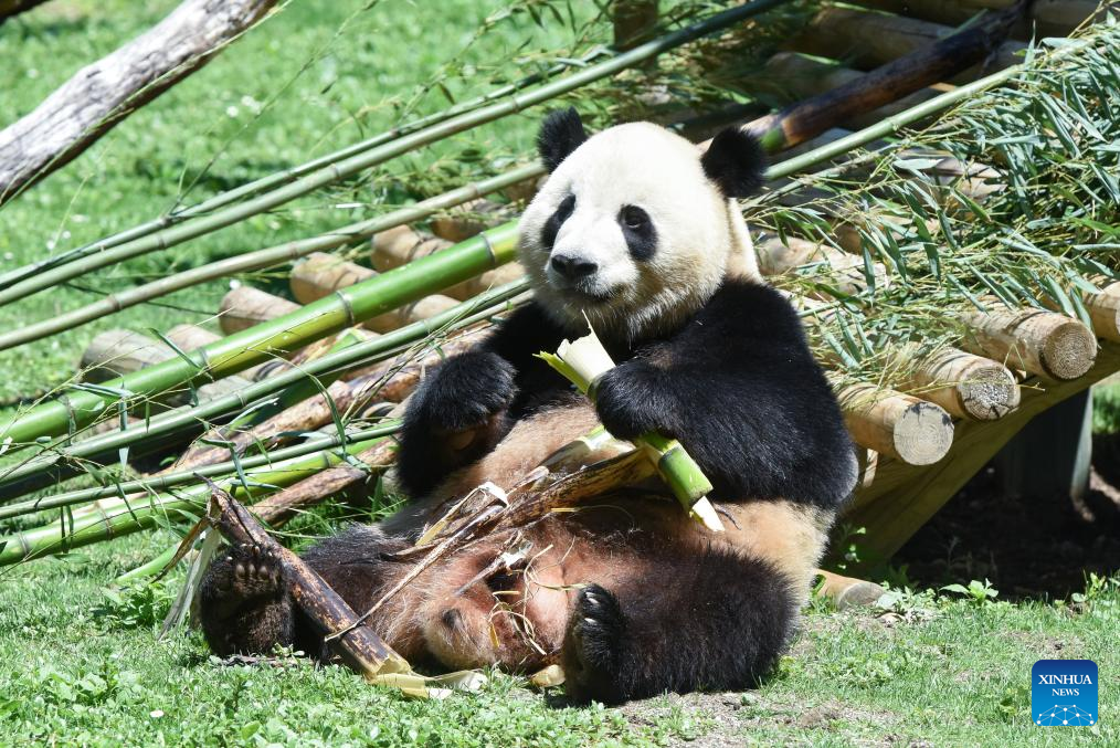 Photo taken on May 30, 2024 shows male panda Jin Xi at Madrid Zoo in Madrid, Spain. Visitors to Spain's Madrid Zoo Aquarium were introduced Thursday to a giant panda couple from China. The new arrivals were welcomed at an official ceremony attended by authorities and experts from both countries. (Photo by Gustavo Valiente/Xinhua)