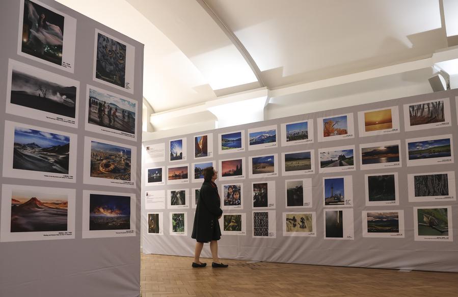A woman looks at photographs at a UK-China arts event in London, Britain, on May 30, 2024. (Xinhua/Han Yan)