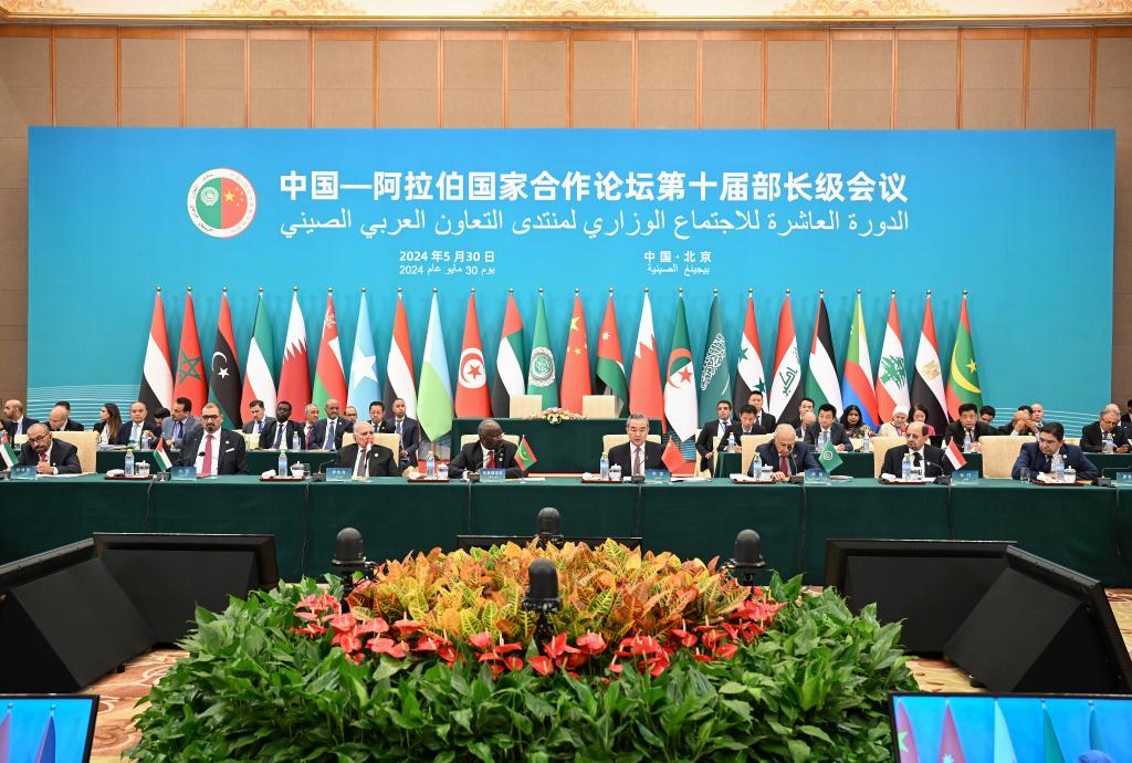 Chinese Foreign Minister Wang Yi, also a member of the Political Bureau of the Communist Party of China Central Committee, and Mohamed Salem Ould Merzouk, Mauritania's minister of foreign affairs, cooperation and Mauritanians abroad, co-chair the 10th ministerial meeting of the China-Arab States Cooperation Forum, in Beijing, capital of China, May 30, 2024. (Xinhua/Zhang Ling)