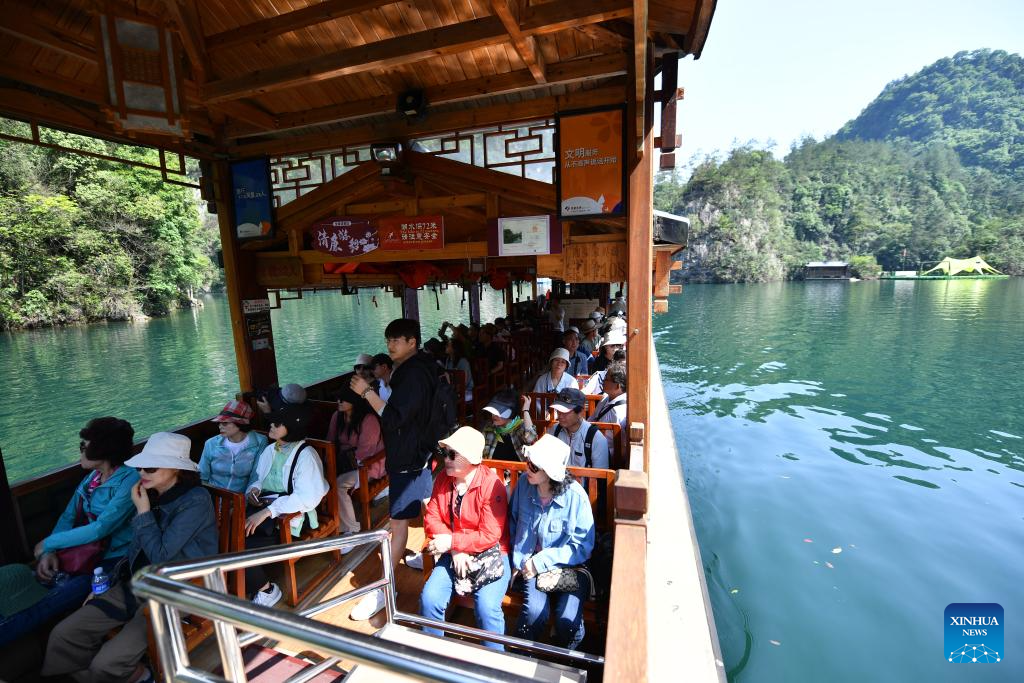 South Korean tourists visit the Baofeng Lake of Wulingyuan District in Zhangjiajie, central China's Hunan Province, May 24, 2024. In the first quarter of 2024, Zhangjiajie saw 105,100 South Korean tourist trips, a 27.07 percent increase compared to the same period in 2019, and is accounted for 40.23 percent of the total number of inbound tourists to Zhangjiajie. Currently, there are direct flights from five cities in South Korea to Zhangjiajie, including Seoul and Busan, with a total of 52 flights per week. (Xinhua/Chen Zhenhai)