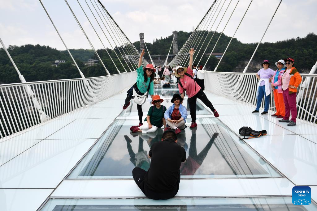 South Korean tourists take photos at a glass-bottomed bridge at Zhangjiajie Grand Canyon in central China's Hunan Province, May 23, 2024. In the first quarter of 2024, Zhangjiajie saw 105,100 South Korean tourist trips, a 27.07 percent increase compared to the same period in 2019, and is accounted for 40.23 percent of the total number of inbound tourists to Zhangjiajie. Currently, there are direct flights from five cities in South Korea to Zhangjiajie, including Seoul and Busan, with a total of 52 flights per week. (Xinhua/Chen Zhenhai)