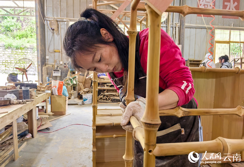 Tang Rongmei works on a bamboo bookcase at a bamboo processing factory in Daguan county, Zhaotong city, southwest China's Yunnan Province. (People's Daily Online/Fu Hao)
