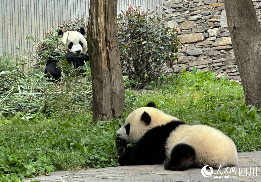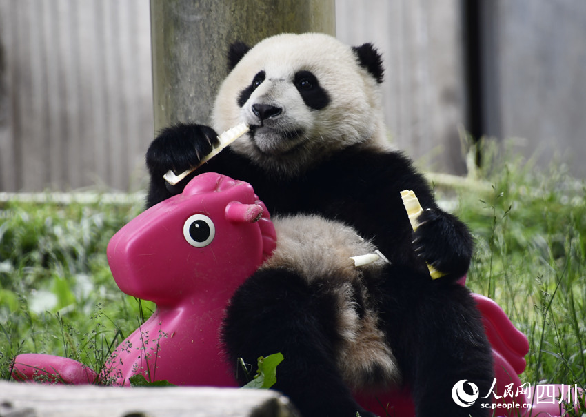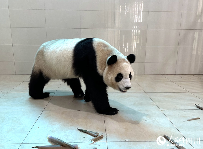Photo shows giant panda "Fu Bao," which is less than four years old and has just returned home from South Korea, at the Shenshuping base of the China Conservation and Research Center for Giant Panda in Wolong, southwest China's Sichuan Province. (People's Daily/Song Haoxin)