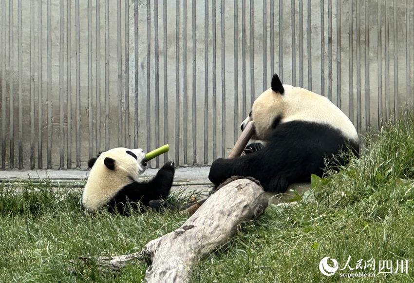 Giant panda "Pan Yue" eats bamboo with her cub in tow at the Shenshuping base of the China Conservation and Research Center for Giant Panda in Wolong, southwest China's Sichuan Province. (People's Daily Online/Wang Bo)