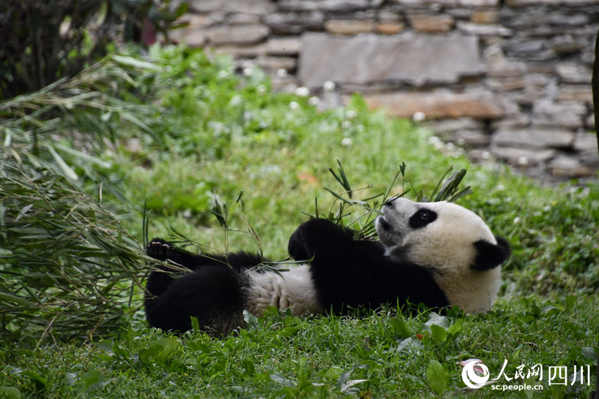 The cub of giant panda "Pan Yue" eats bamboo while lying on the ground at the Shenshuping base of the China Conservation and Research Center for Giant Panda in Wolong, southwest China's Sichuan Province. (People's Daily Online/Wang Bo)