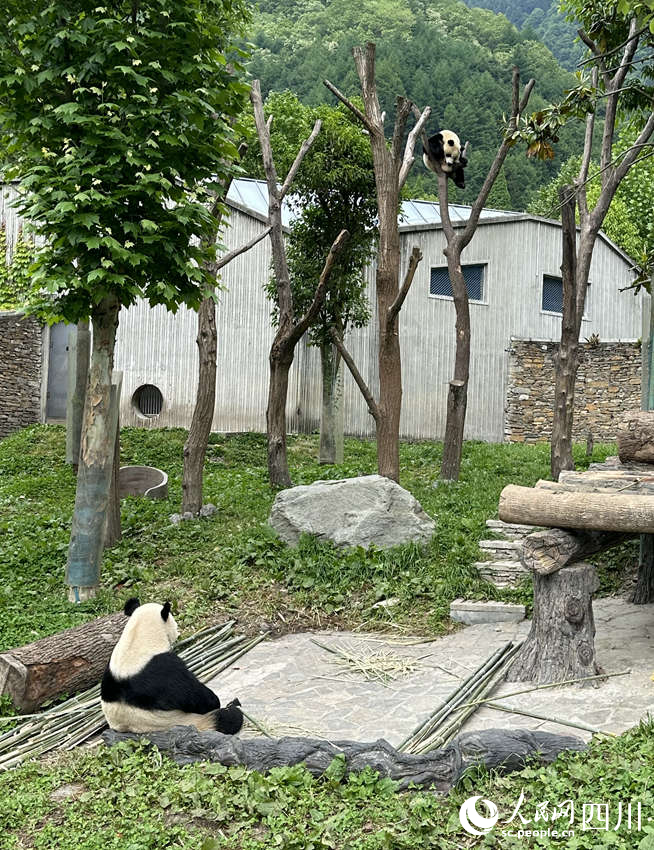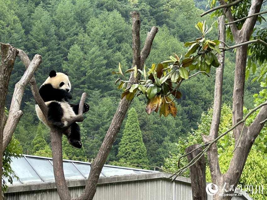 The cub of giant panda "Xinxin" climbs a tree at the Shenshuping base of the China Conservation and Research Center for Giant Panda in Wolong, southwest China's Sichuan Province. (People's Daily Online/Wang Bo)