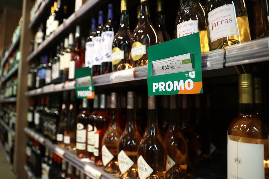 Bottles of wine are on display at a supermarket in Brussels, Belgium, on May 31, 2024. (Xinhua/Zhao Dingzhe)