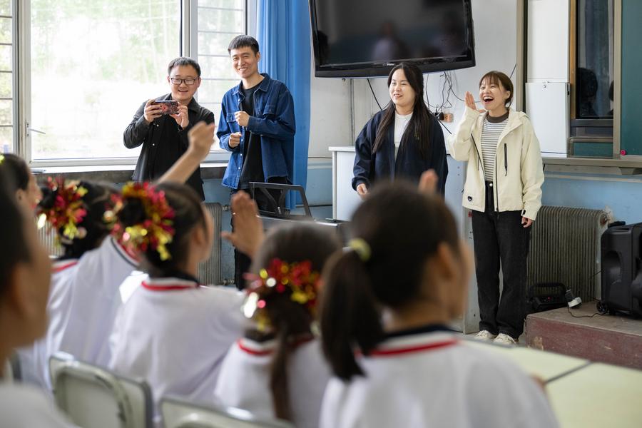 Teacher Li Ping (1st R) records chorus videos at the Renmin Town Central Primary School in Anda City, northeast China's Heilongjiang Province, May 29, 2024. (Xinhua/Xie Jianfei)