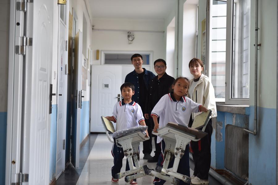Teacher Li Ping (L, back) and teacher Zhang Yu (C, back) watch the children go back to their classrooms after practicing chorus at the Zhongben Town Central Primary School in Anda City, northeast China's Heilongjiang Province, May 29, 2024. (Xinhua/Ding He)