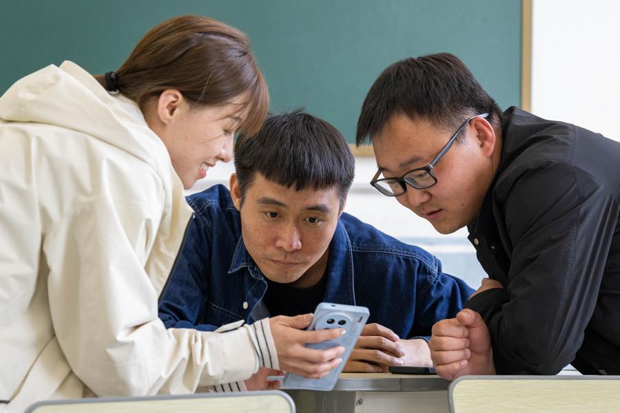 Teacher Li Ping (C) and teacher Zhang Yu (R) communicate with a teacher of the new music class at the Zhongben Town Central Primary School in Anda City, northeast China's Heilongjiang Province, May 29, 2024. (Xinhua/Xie Jianfei)