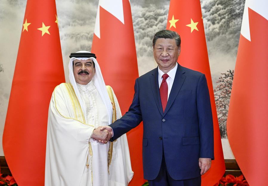 Chinese President Xi Jinping shakes hands with Bahrain's King Hamad bin Isa Al Khalifa in Beijing, capital of China, May 31, 2024. Xi held talks with Hamad at the Great Hall of the People in Beijing on Friday. Xi and Hamad witnessed the signing of bilateral cooperation documents after their talks. Hamad, who is in China on a state visit, attended the opening ceremony of the 10th ministerial conference of the China-Arab States Cooperation Forum. (Xinhua/Yao Dawei)