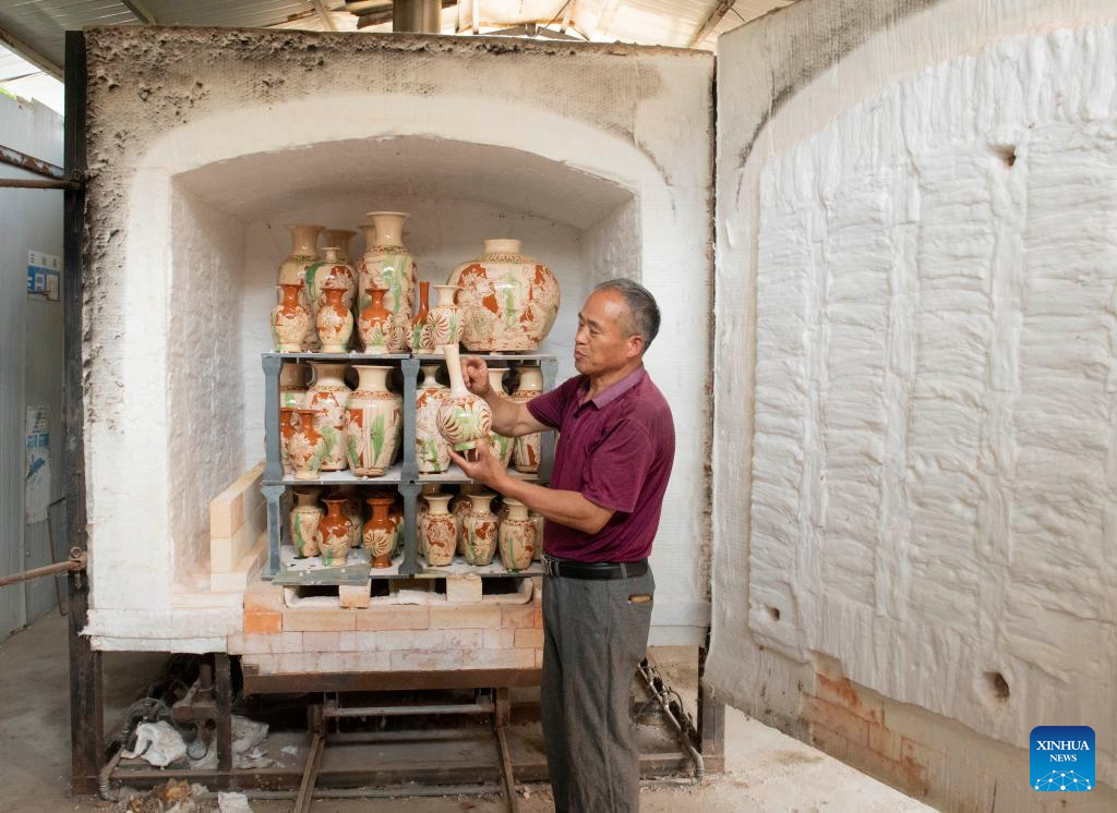 Lu Yilin, a city-level inheritor of Jieshou painted pottery, checks on painted pottery works outside the kiln in Jieshou City of east China's Anhui Province, May 23, 2024. (Xinhua/Fu Tian)