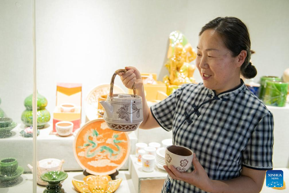 Xing Shuqin, a provincial inheritor of Jieshou painted pottery, shows a tea pot made by herself at the painted pottery museum in Tianying Township of Jieshou City in east China's Anhui Province, May 23, 2024. (Xinhua/Fu Tian)