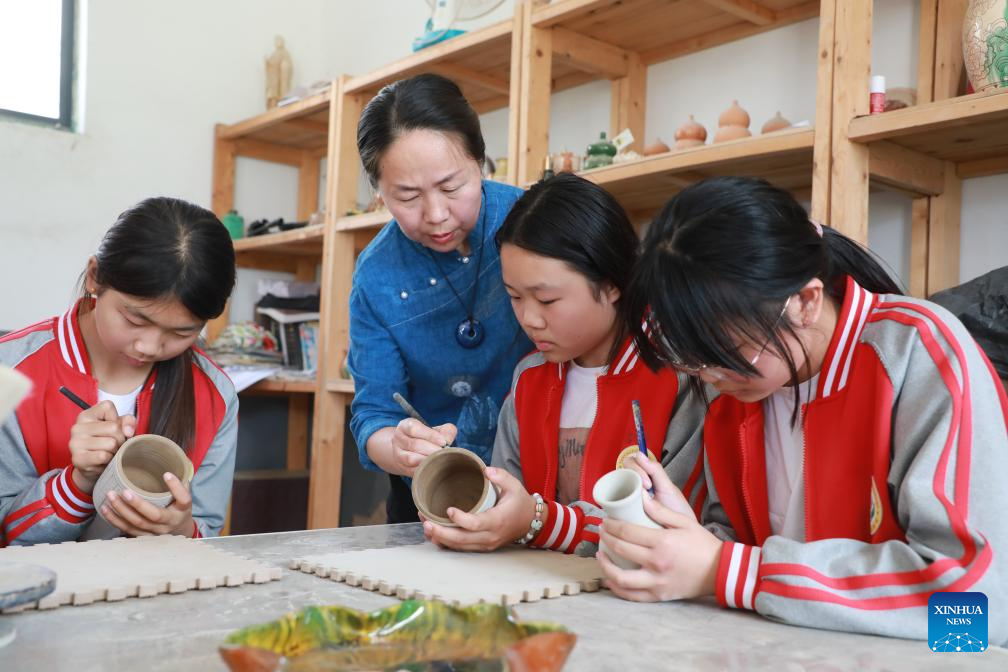 Xing Shuqin (2nd L), a provincial inheritor of Jieshou painted pottery, instructs students of a study tour on the engraving and painting of pottery at the painted pottery museum in Tianying Township of Jieshou City in east China's Anhui Province, May 29, 2024. (Jieshou Integrated Media Center/Handout via Xinhua)