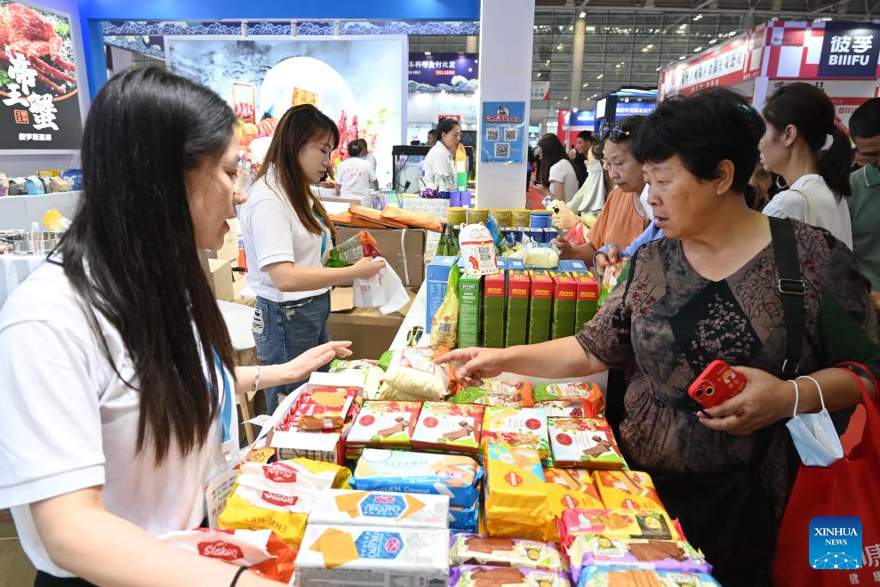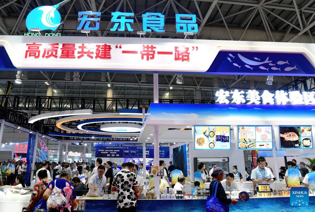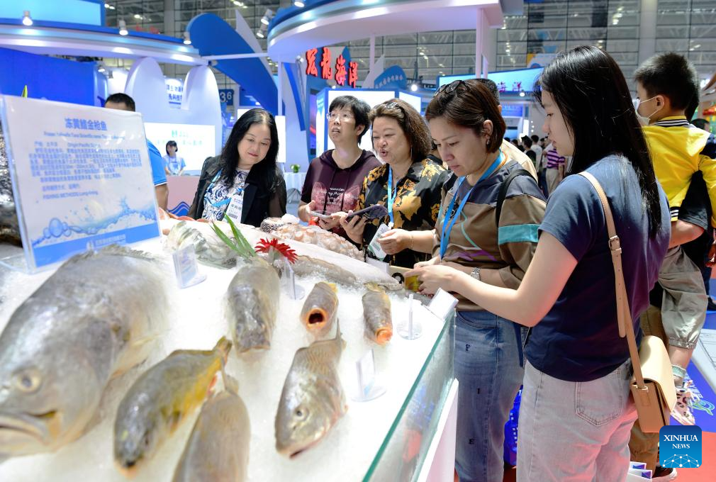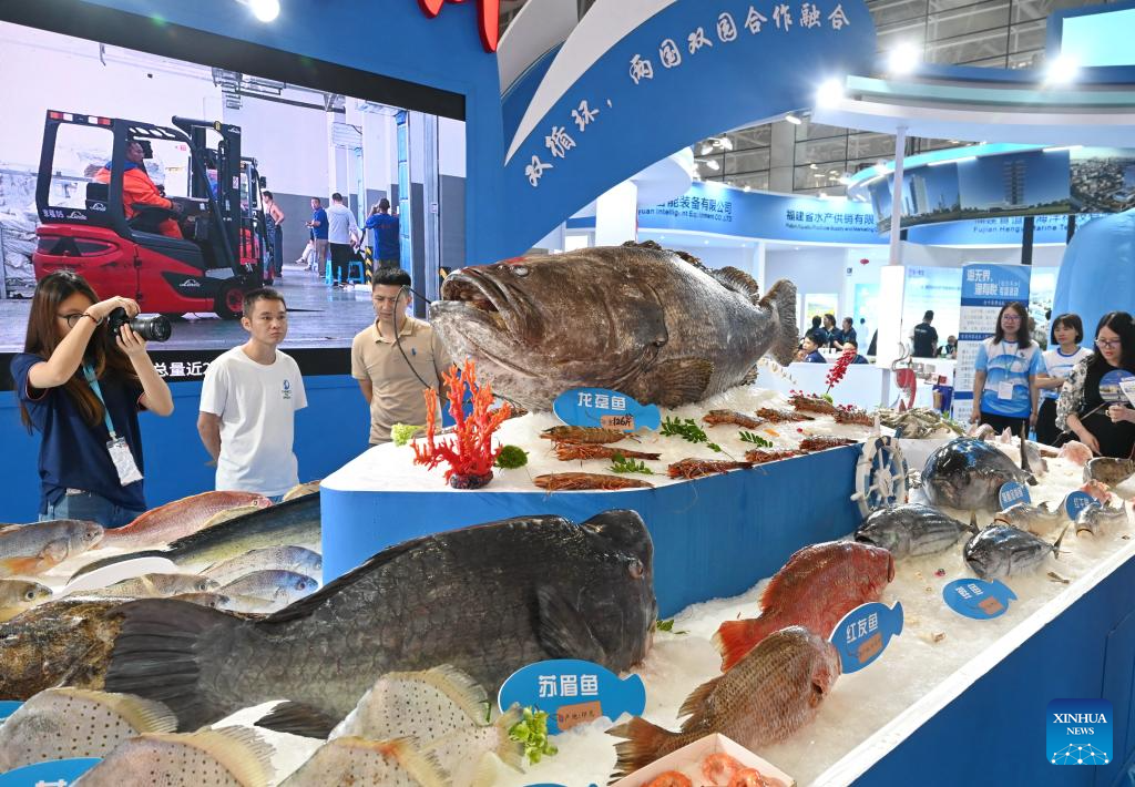 People visit the 2024 China (Fuzhou) International Seafood &Fisheries Expo in Fuzhou, capital of southeast China's Fujian Province, May 31, 2024. The 2024 China (Fuzhou) International Seafood &Fisheries Expo kicked off at Fuzhou Strait International Conference &Exhibition Center in Fuzhou Friday, attracting nearly 500 companies from more than 30 countries and regions. The expo involves aquaculture, ocean fishing, aquatic processing and other fishery industry sectors. (Xinhua/Wei Peiquan)