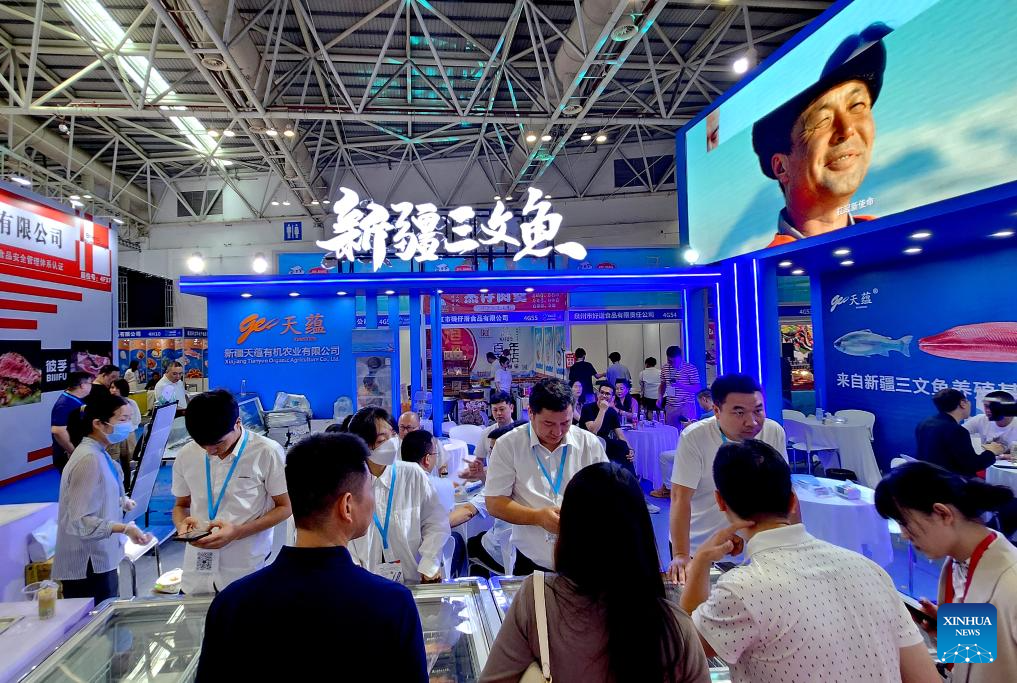 People learn about salmon from China's Xinjiang Uygur Autonomous Region at the 2024 China (Fuzhou) International Seafood &Fisheries Expo in Fuzhou, capital of southeast China's Fujian Province, May 31, 2024. The 2024 China (Fuzhou) International Seafood &Fisheries Expo kicked off at Fuzhou Strait International Conference &Exhibition Center in Fuzhou Friday, attracting nearly 500 companies from more than 30 countries and regions. The expo involves aquaculture, ocean fishing, aquatic processing and other fishery industry sectors. (Xinhua/Wei Peiquan)