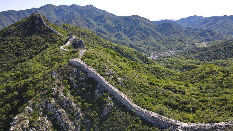An aerial drone photo taken on June 1, 2024 shows the Great Wall and the Shixia Village in Yanqing District of Beijing, capital of China. (Xinhua/Chen Zhonghao)