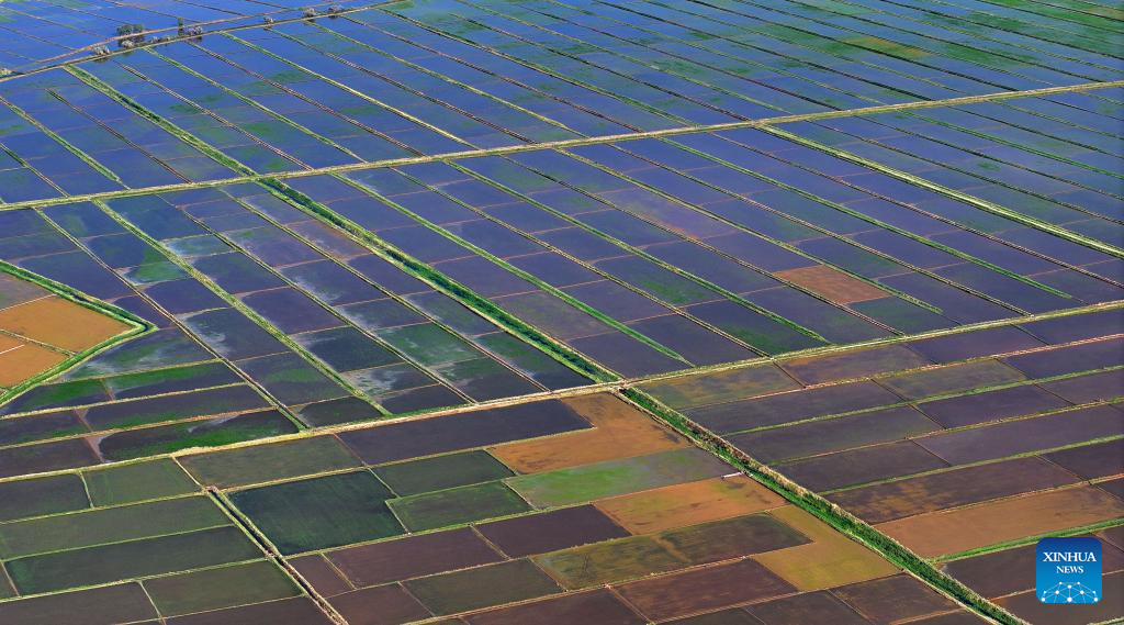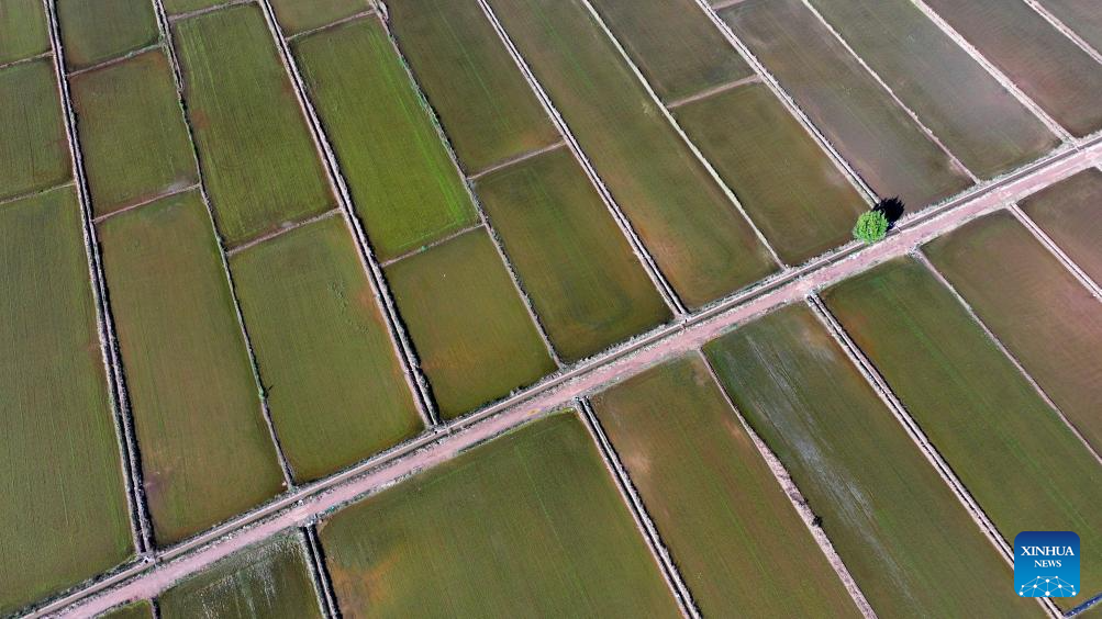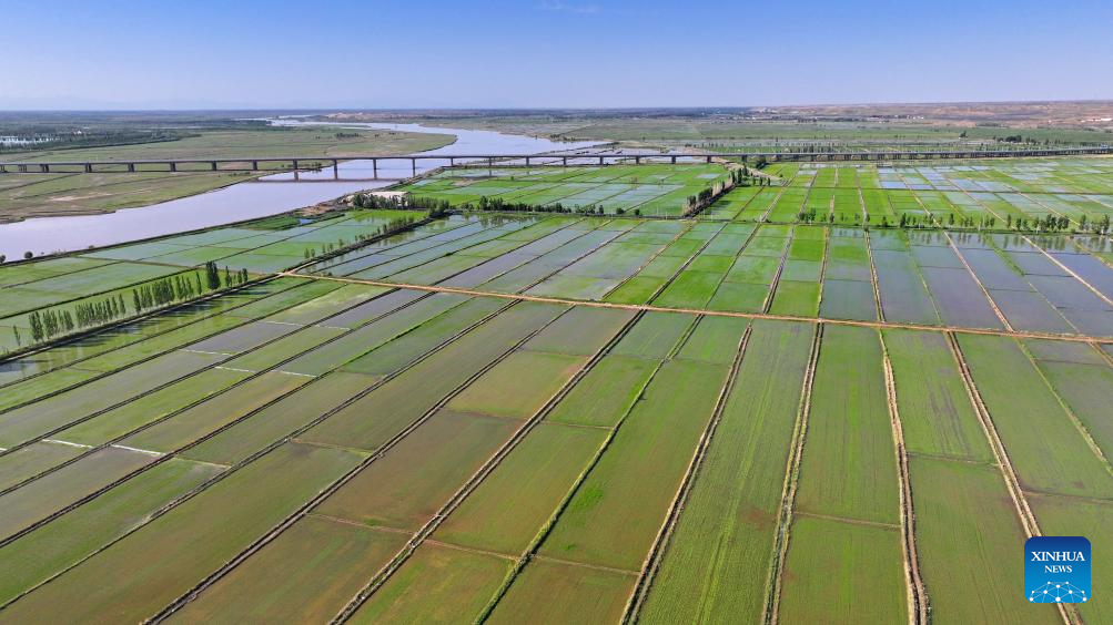 An aerial drone photo taken on May 30, 2024 shows the paddy fields along the Yellow River in Yinchuan, northwest China's Ningxia Hui Autonomous Region. This rice planting season has drawn to an end. Abundant supply of water and sunshine in June injects extra vigor into these newly planted seedlings. (Xinhua/Wang Peng)