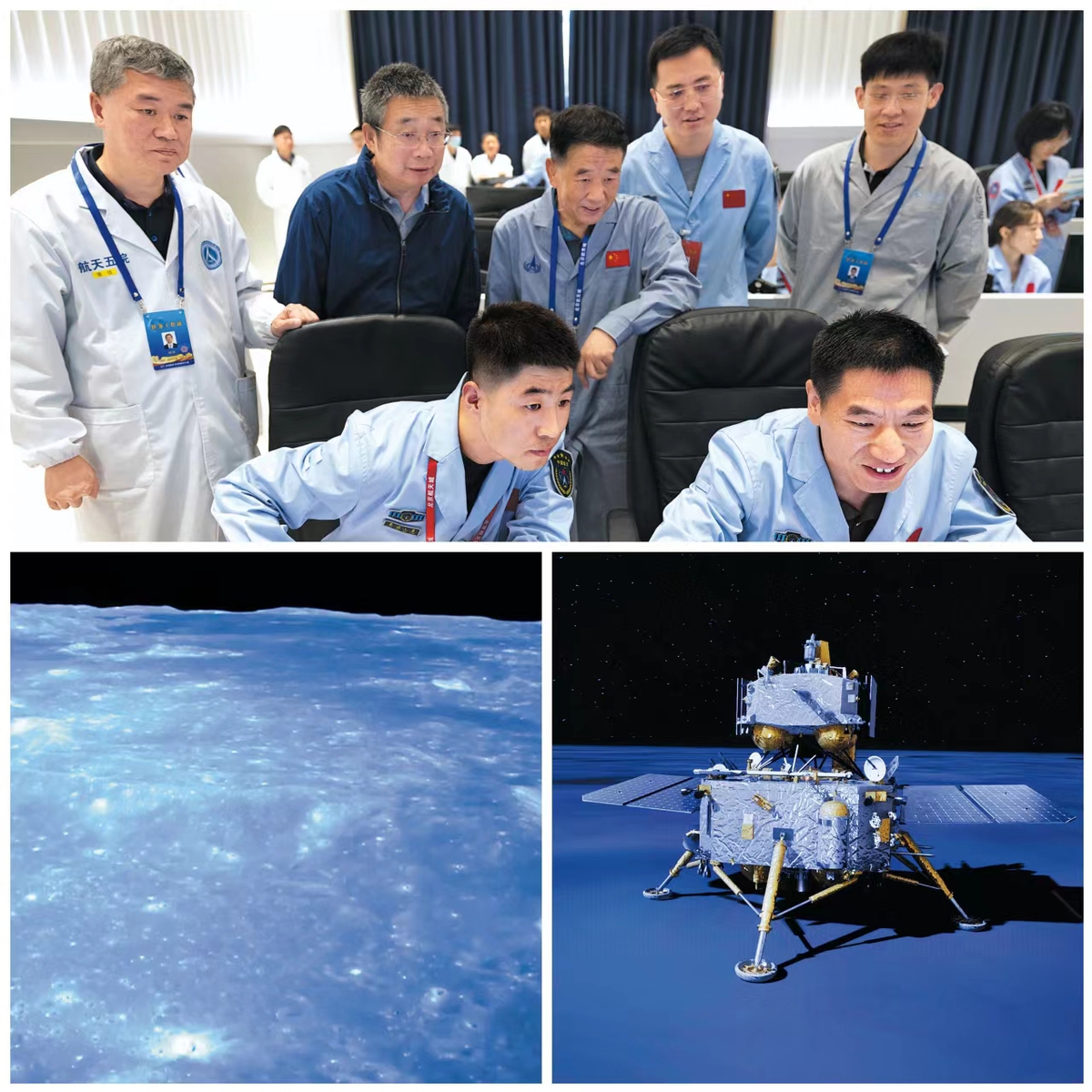 Clockwise from top: Staff members at the Beijing Aerospace Control Center review data from the lunar far side transmitted by the Chang'e 6 robotic probe on Sunday; a simulation shows the probe's landing craft touching down at a designated site in the South Pole-Aitken Basin; and a video grab of the lunar surface captured by the lander's descent camera. The Chang'e 6 probe is on a historic mission to collect samples from the moon's far side. JIN LIWANG/XINHUA/CHINA DAILY