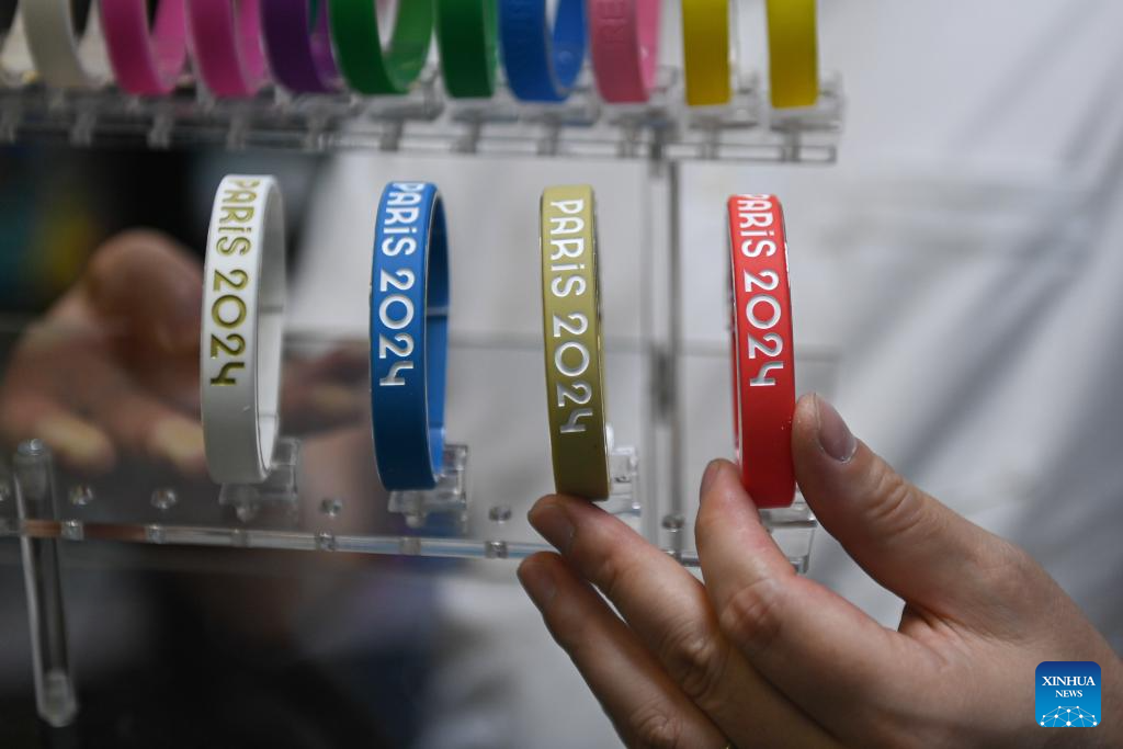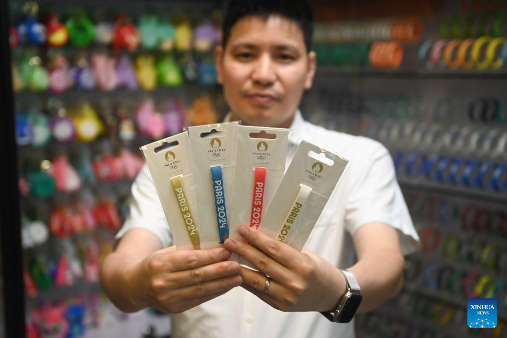 A businessman shows licensed silicone wristbands for the Paris 2024 Olympic Games in Yiwu, east China's Zhejiang Province, May 30, 2024. Yiwu, a world-famous small commodities manufacturing hub, is buzzing with production orders with the approach of the Paris 2024 Olympic Games. (Xinhua/Huang Zongzhi)