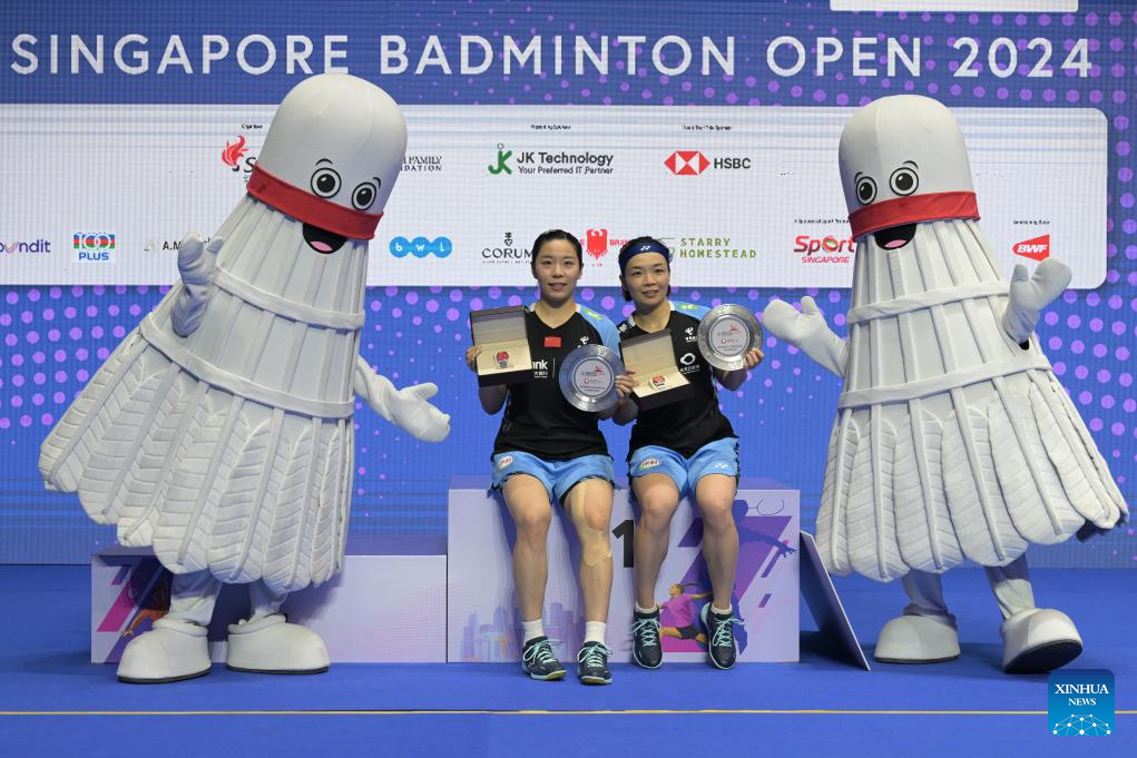 Chen Qingchen (R)/Jia Yifan of China attend the awarding ceremony for the women's doubles at the Singapore Badminton Open 2024 in Singapore, June 2, 2024. (Photo by Then Chih Wey/Xinhua)