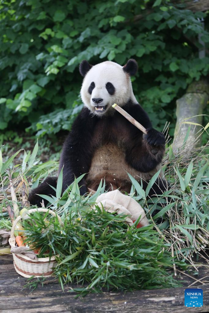 Giant panda Tian Bao enjoys a birthday meal at the Pairi Daiza Zoo in Brugelette, Belgium, June 2, 2024. The Belgian Pairi Daiza Zoo celebrated the 8th birthday of giant panda Tian Bao on Sunday. (Xinhua/Zhao Dingzhe)
