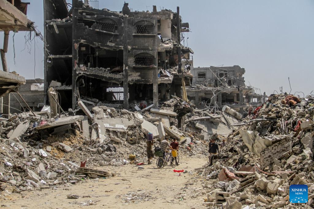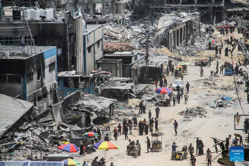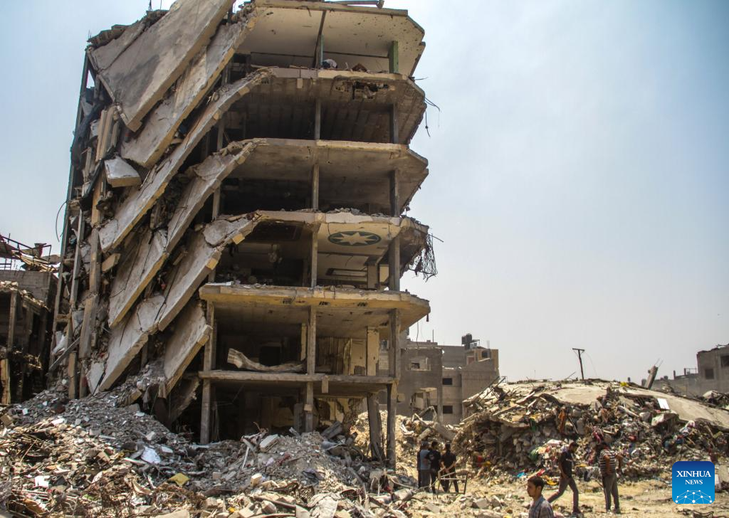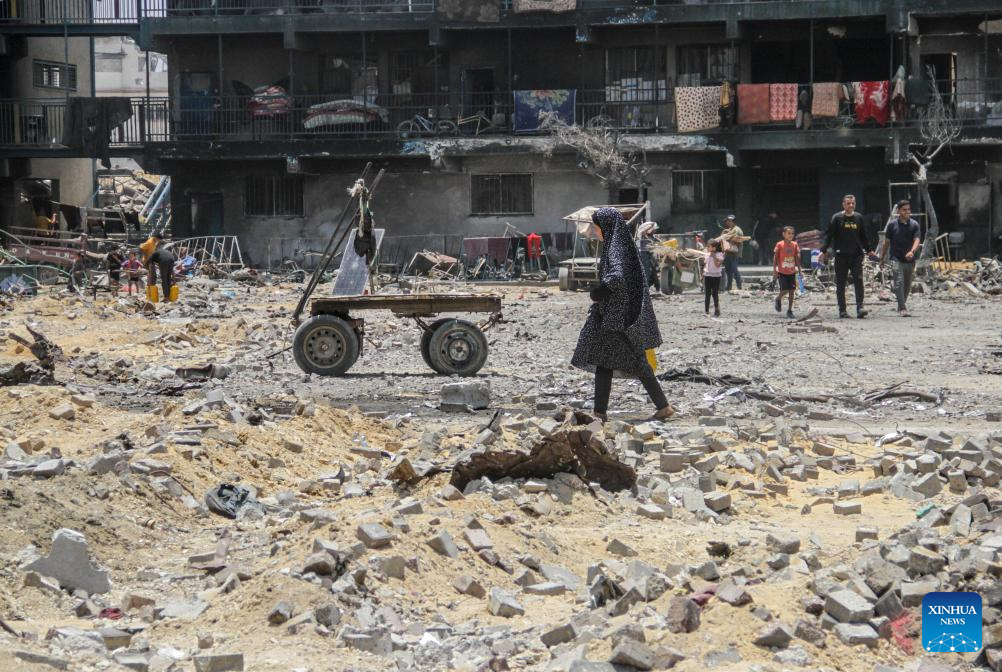 People are seen near destroyed buildings at the Jabalia camp in the northern Gaza Strip, on June 3, 2024. Days after the Israeli army withdrew from Jabalia camp in the northern Gaza Strip after nearly three weeks of military operation, Mohammed Omran, who returned to the camp, is still in shock due to the scale and intensity of destruction in his neighborhood. During the offensive, at least 50,000 housing units were destroyed. Meanwhile, most of the sewage networks and roads in northern Gaza were completely damaged, according to Naji Sarhan, head of the municipal emergency committee in northern Gaza. (Photo by Mahmoud Zaki/Xinhua)