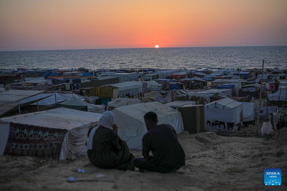 People are silhouetted against sunset above temporary tents for displaced Palestinians in the Mawasi area in the southern Gaza Strip city of Khan Younis, on June 4, 2024. On May 7, the Israeli army expanded its military operation in Rafah, ordering more than 1.5 million Palestinians sheltering there to head to Khan Younis and other central areas of Gaza. (Photo by Rizek Abdeljawad/Xinhua)