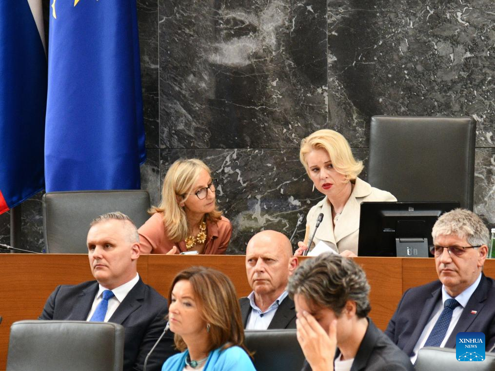 Slovenian Parliamentary Speaker Urska Klakocar Zupancic (R, Rear) attends the parliamentary session dedicated to the recognition of Palestine in Ljubljana, Slovenia, on June 4, 2024. The Slovenian Parliament on Tuesday voted to approve the proposal of recognizing the statehood of Palestine, a move the legislator body said would hopefully help stop the violence in Gaza. (Bozidar Kolar/STA/Handout via Xinhua)