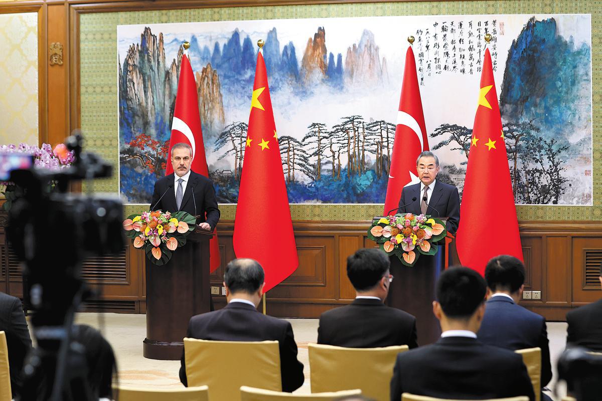 Foreign Minister Wang Yi (right) and Turkish Foreign Minister Hakan Fidan meet the media on Tuesday during a joint news conference after their meeting in Beijing. WANG ZHUANGFEI / CHINA DAILY