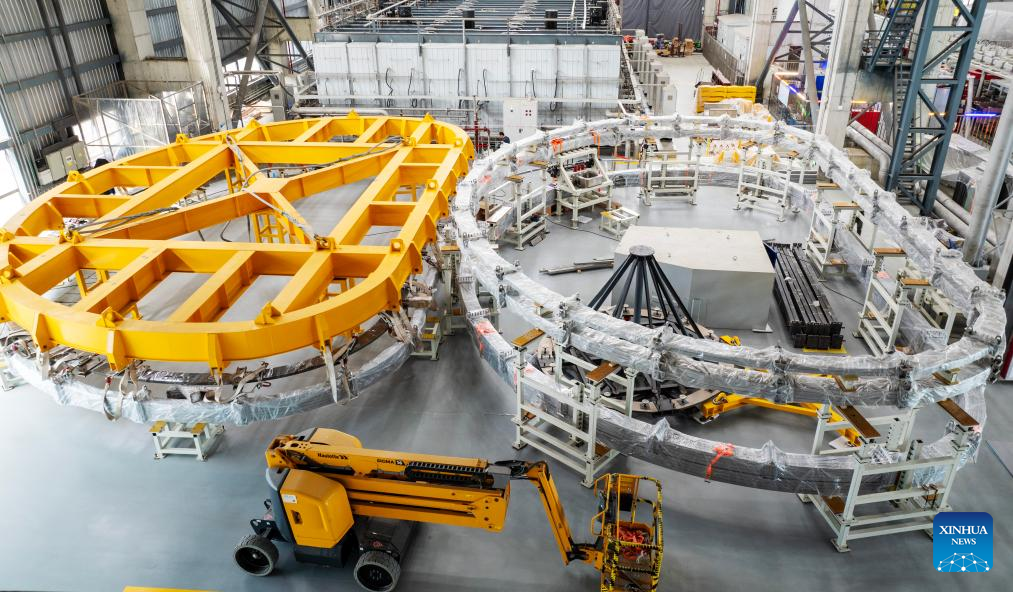 A drone photo taken on May 27, 2024 shows the superconducting toroidal field coil winding line at the park of Comprehensive Research Facility for Fusion Technology (CRAFT) in Hefei, east China's Anhui Province. (Photo by Zhao Xianfu/Xinhua)