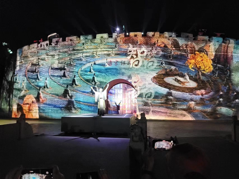 The palace wall of the Confucius scenic area is illuminated by a light show in Qufu, east China's Shandong Province. (Photo/Chen Shuguang)
