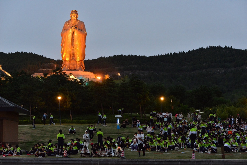 Students gathered at the foot of the Confucius statue in the Nishan Sacredland in Qufu, east China's Shandong Province. (Photo/Yu Zhenze)