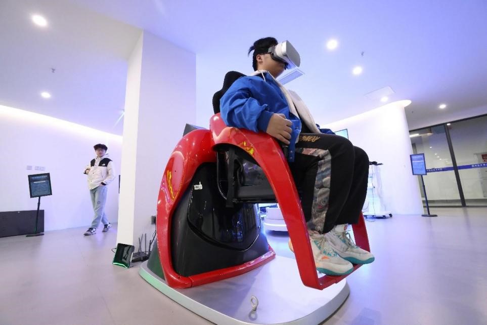 A student at Fuzhou Software Technology Vocational College, southeast China's Fujian province experiences virtual reality. (People's Daily Online/Wang Wangwang)
