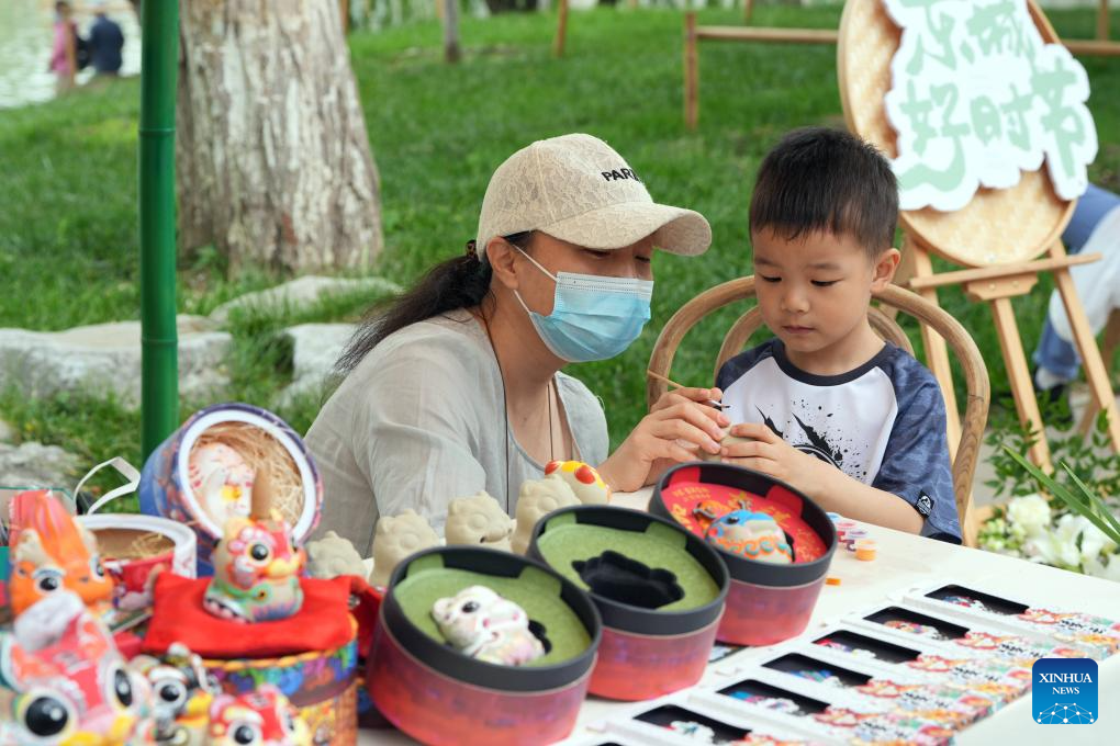 A child tries Tuye (a traditional Chinese figurine and auspicious symbol) coloring at Longtan Park in Dongcheng District in Beijing, capital of China, June 5, 2024. (Xinhua/Ju Huanzong)?