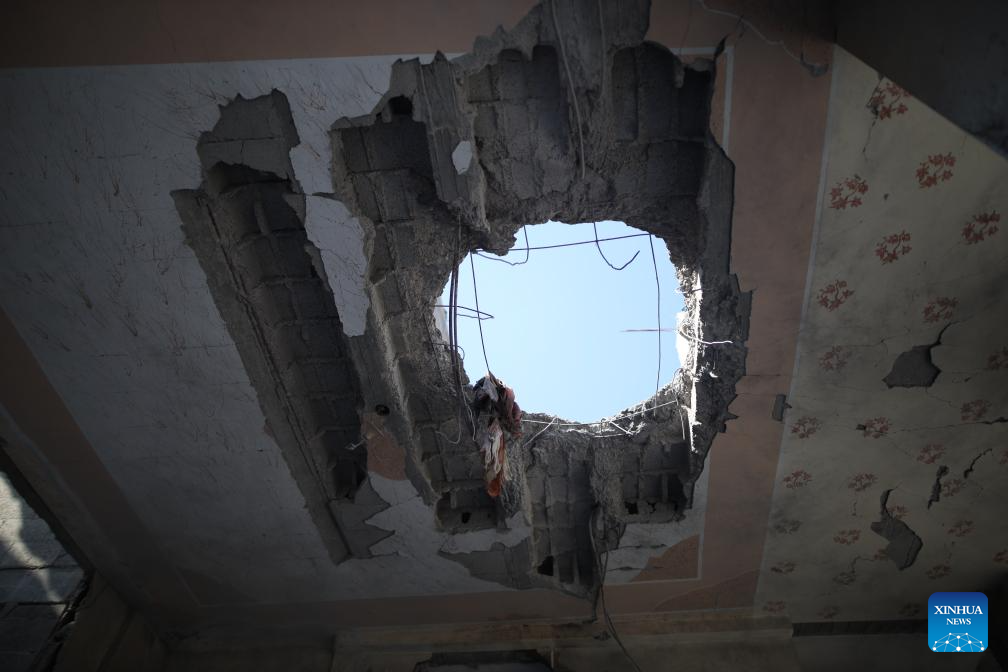 A destroyed building is seen after an Israeli attack in the Al-Maghazi refugee camp in the central Gaza Strip, on June 5, 2024. At least 75 Palestinians were killed in Israeli overnight attacks on several areas in the central Gaza Strip, Palestinian sources said on Wednesday. Security sources told Xinhua that Israeli aircraft and artillery bombed several locations overnight in the Al-Bureij and Al-Maghazi refugee camps and east of Deir al-Balah in central Gaza. (Photo by Marwan Daoud/Xinhua)