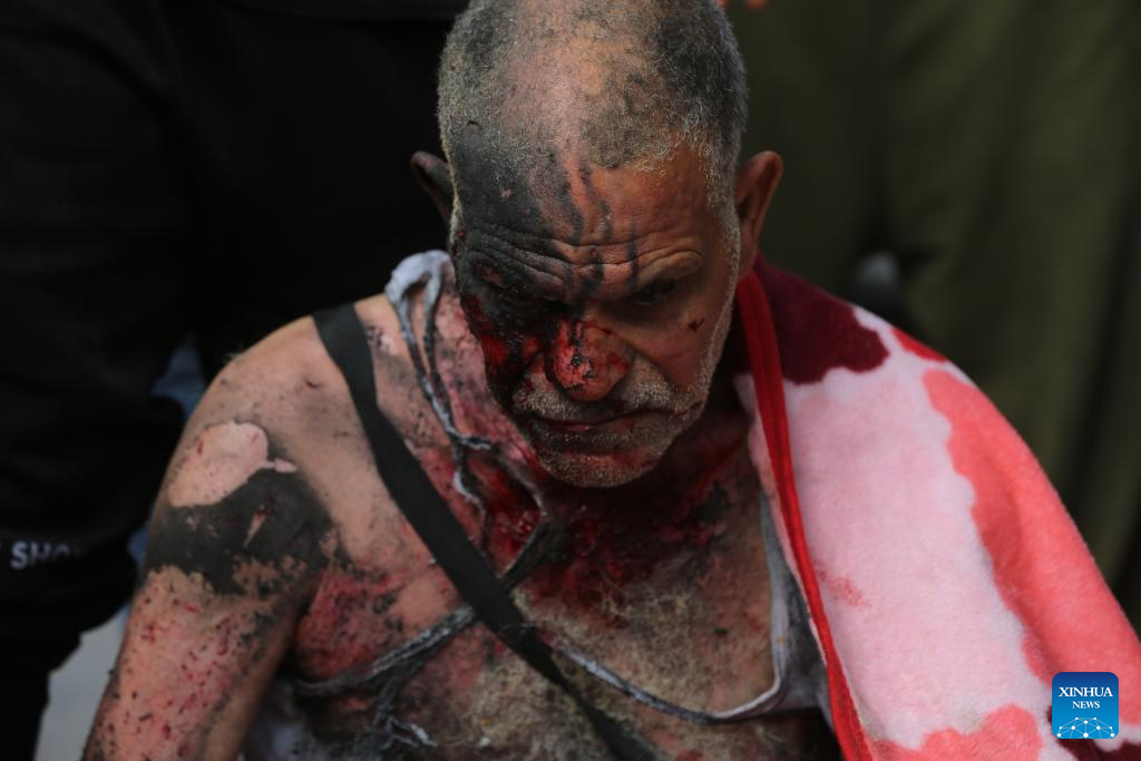 A man is seen injured after an Israeli attack in the Al-Maghazi refugee camp in central Gaza, on June 5, 2024. At least 75 Palestinians were killed in Israeli overnight attacks on several areas in the central Gaza Strip, Palestinian sources said on Wednesday. Security sources told Xinhua that Israeli aircraft and artillery bombed several locations overnight in the Al-Bureij and Al-Maghazi refugee camps and east of Deir al-Balah in central Gaza. (Photo by Marwan Daoud/Xinhua)
