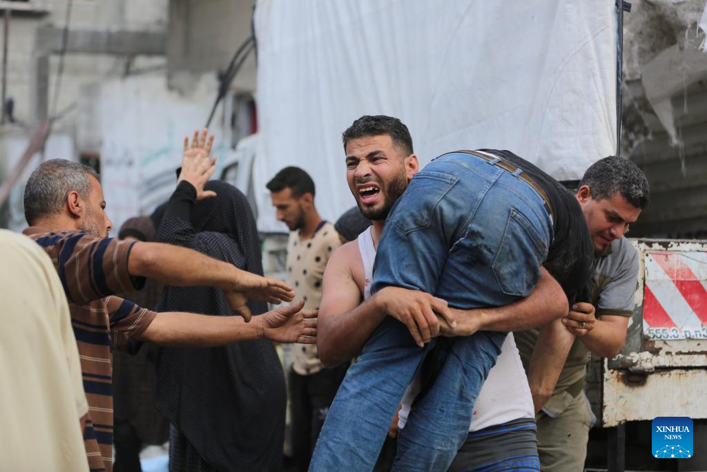 People carry an injured person after an Israeli attack in the Al-Maghazi refugee camp in central Gaza, on June 5, 2024. At least 75 Palestinians were killed in Israeli overnight attacks on several areas in the central Gaza Strip, Palestinian sources said on Wednesday. Security sources told Xinhua that Israeli aircraft and artillery bombed several locations overnight in the Al-Bureij and Al-Maghazi refugee camps and east of Deir al-Balah in central Gaza. (Photo by Marwan Daoud/Xinhua)